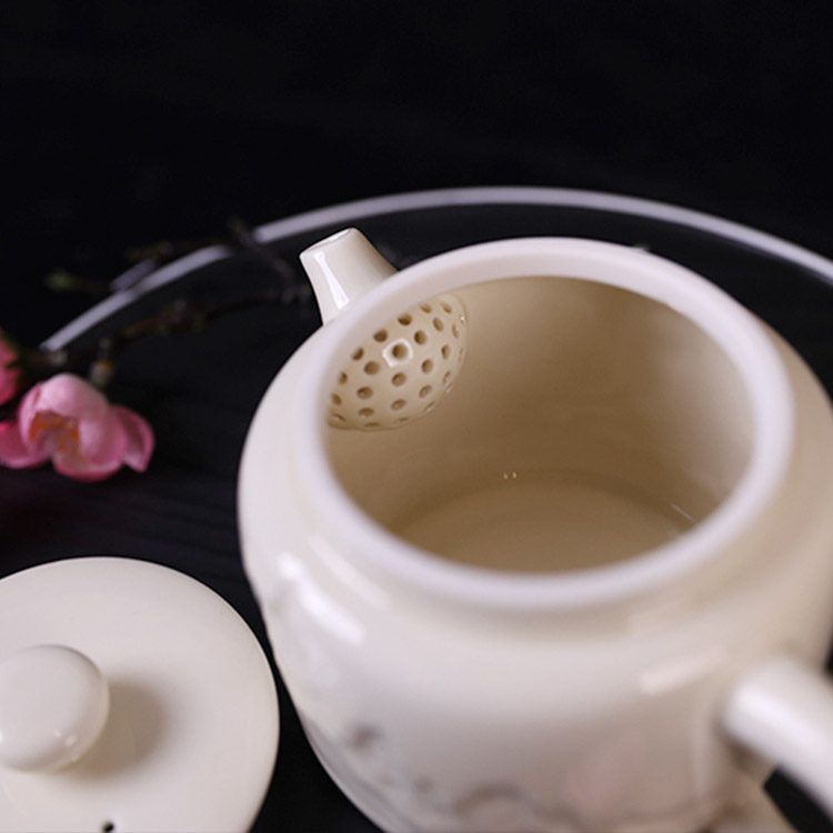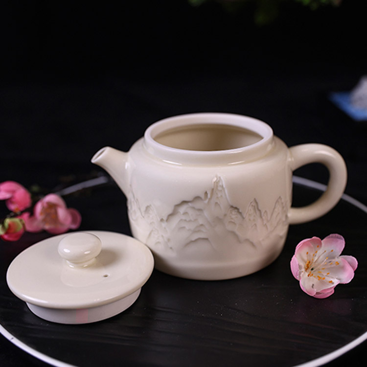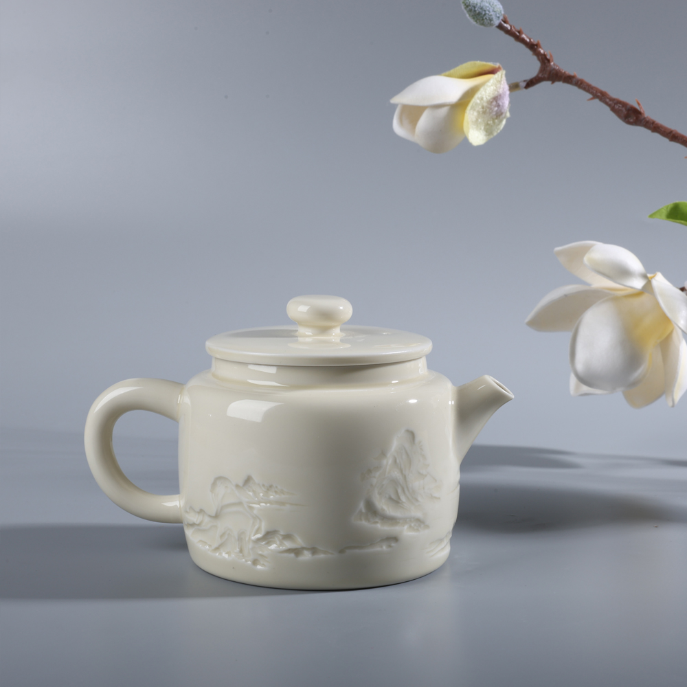 山居慢品,茶語人間。大宋定窯的一款山居茶壺,以精工雕刻之山居景色,呈現栩栩如生的浮雕效果。采用高溫燒制,釉面光滑細膩,手感舒適。釉水采用古法配方,色白且微泛黃,采用浮雕+定瓷傳統燒制技藝,彰顯原礦胎釉的古風之美。